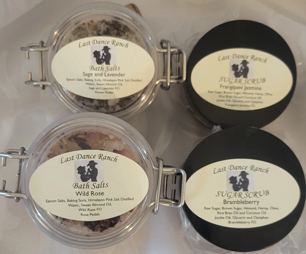 These come in an adorable bail jar. You will want to collect them and use them for other uses. These bath salts are a simple mixture of high quality Epsom Salts, Himalaya pink salt, baking soda and Almond oil. These can be made in any scent mentioned in this website. Just mention the scent in the comments. They will also be topped with a floral mixture to pretty your bath experience.